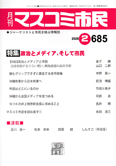 特集以外では、創刊号から約10年間のマスコミ市民を読み直した永田浩三編集委員のご寄稿も掲載しています。